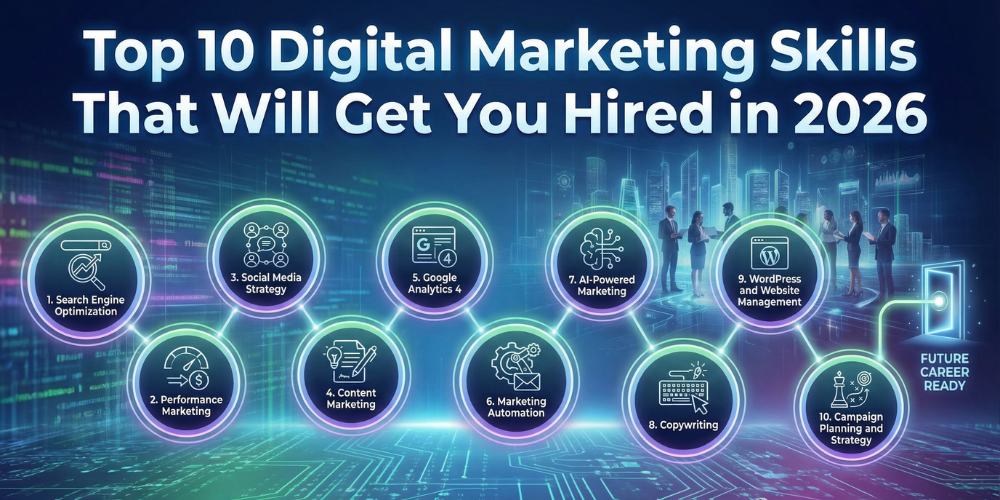 If you want to get hired in 2026, focus on skills that are practical, measurable, and future-ready. SEO, performance marketing, analytics, AI, content, and strategy are all essential parts of a modern digital marketing career.